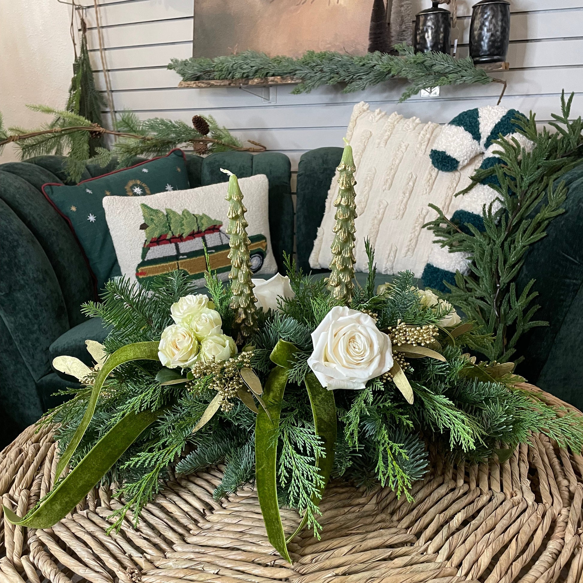 Christmas Tree Taper with Flowers Centerpiece